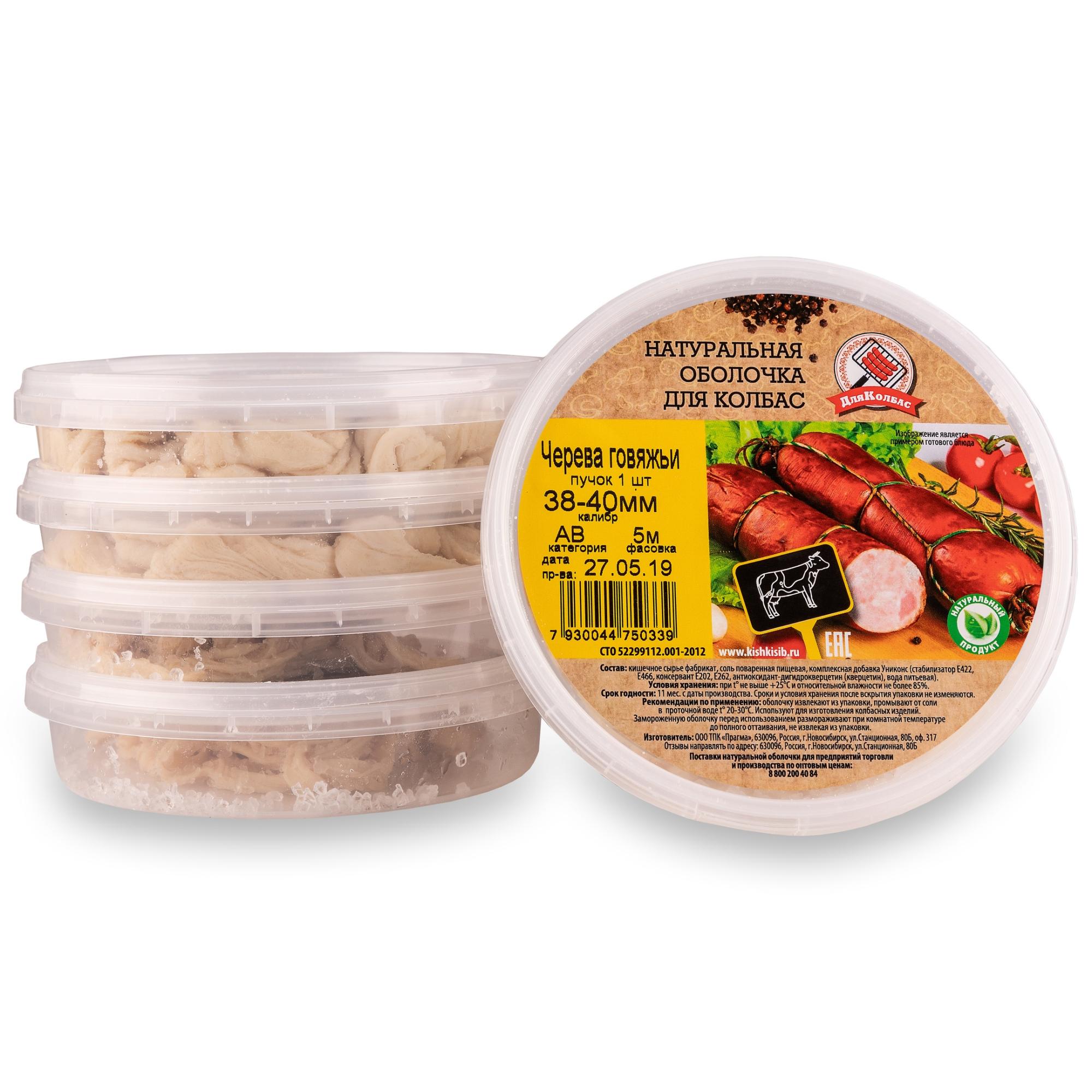 Натуральная оболочка говяжья 38-40 мм — говяжья черева самый крепкий и эластичный вид натуральной оболочки. Используется для приготовления сыровяленых колбас, купат, сарделек, Краковской колбасы. После термической обработки продукта структура говяжьей черевы может показаться жесткой – поэтому в подавляющем большинстве случаев она не употребляется с получившимся колбасным изделием.